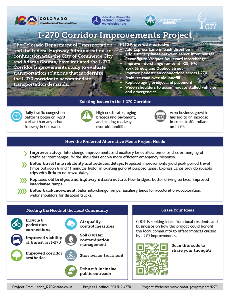 Hello and welcome to our virtual open house. I-270 is the most congested freeway in the state of Colorado. CDOT is looking forward to making improvements in this corridor to better accommodate many forms of transportation. If you missed our previous virtual events in 2020 you can get up to speed by viewing past meeting contents on the project website at the link in the presentation below this video. Scroll through our open house and read through the information below to learn about community commitments, project design details and the project schedule. Express Lanes are included in the Preferred Alternative. Analysis and support for this decision is included in the detailed comparison with a traditional general purpose lane. When you see information that you have a question about or would like to provide input on, use the comment box below each display to submit your question or comment. If you’d like to stay informed in the future, scroll to the bottom of this open house site to sign up for email updates. Thank you for helping us shape the future of the I-270 corridor.