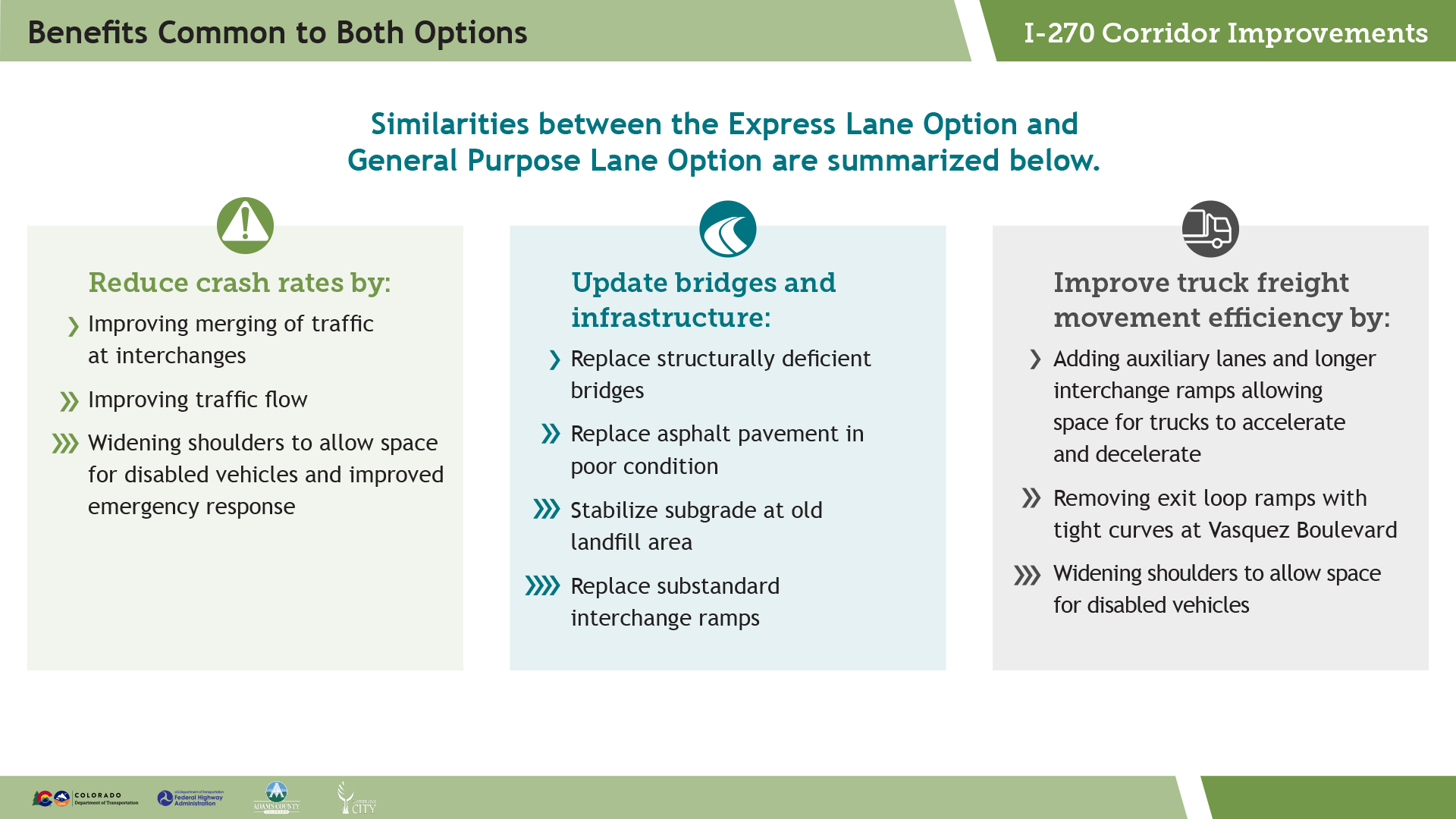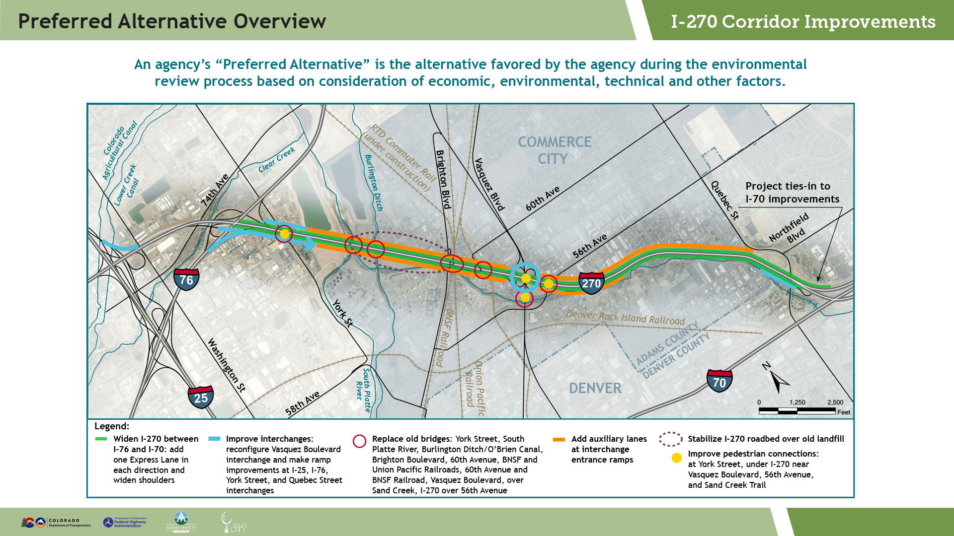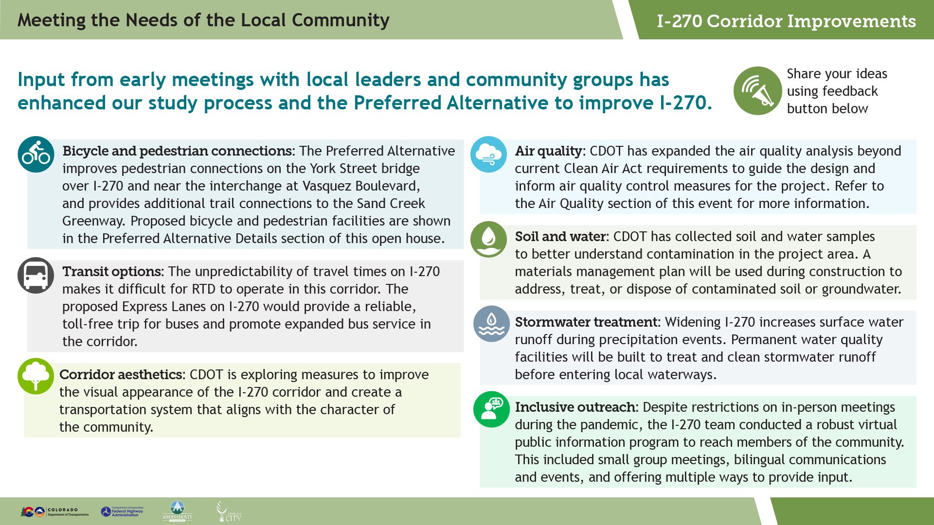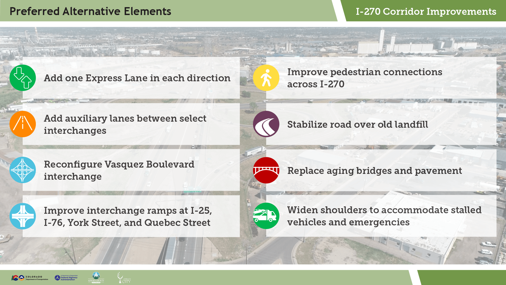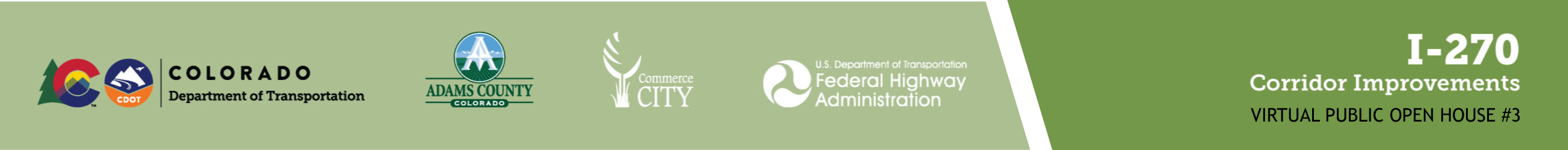 Hello and welcome to our virtual open house. I-270 is the most congested freeway in the state of Colorado. CDOT is looking forward to making improvements in this corridor to better accommodate many forms of transportation. If you missed our previous virtual events in 2020 you can get up to speed by viewing past meeting contents on the project website at the link in the presentation below this video. Scroll through our open house and read through the information below to learn about community commitments, project design details and the project schedule. Express Lanes are included in the Preferred Alternative. Analysis and support for this decision is included in the detailed comparison with a traditional general purpose lane. When you see information that you have a question about or would like to provide input on, use the comment box below each display to submit your question or comment. If you’d like to stay informed in the future, scroll to the bottom of this open house site to sign up for email updates. Thank you for helping us shape the future of the I-270 corridor.