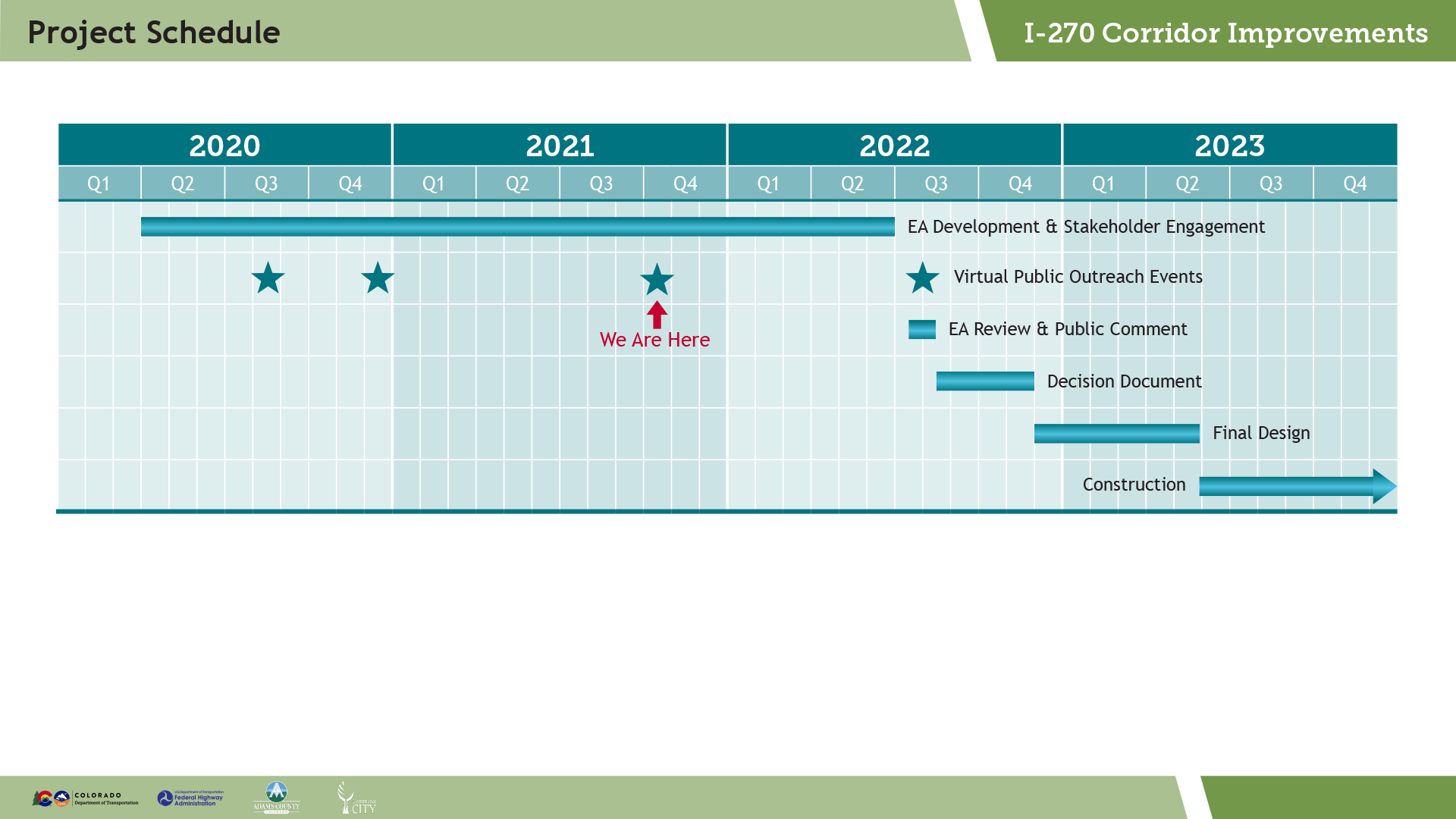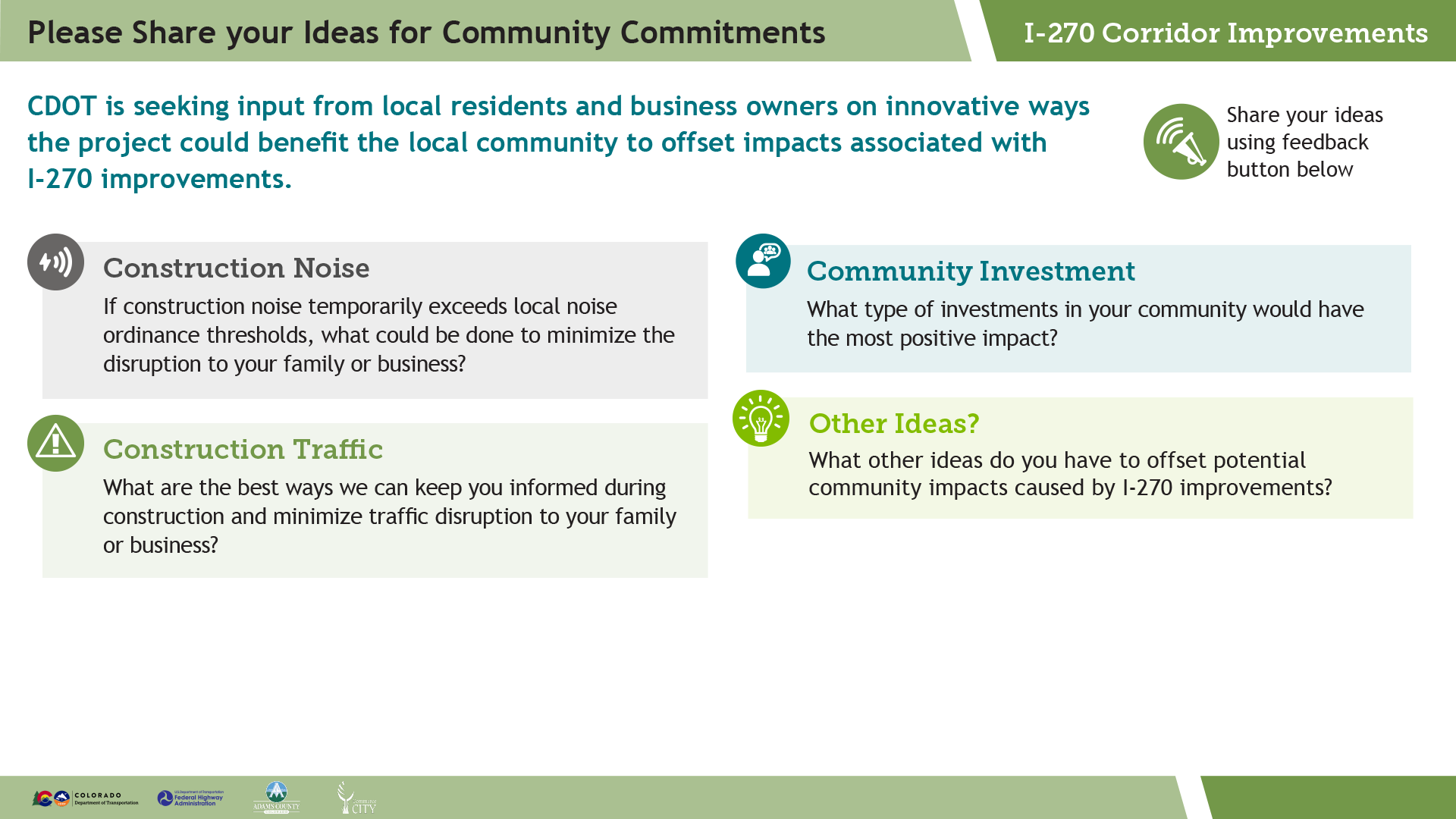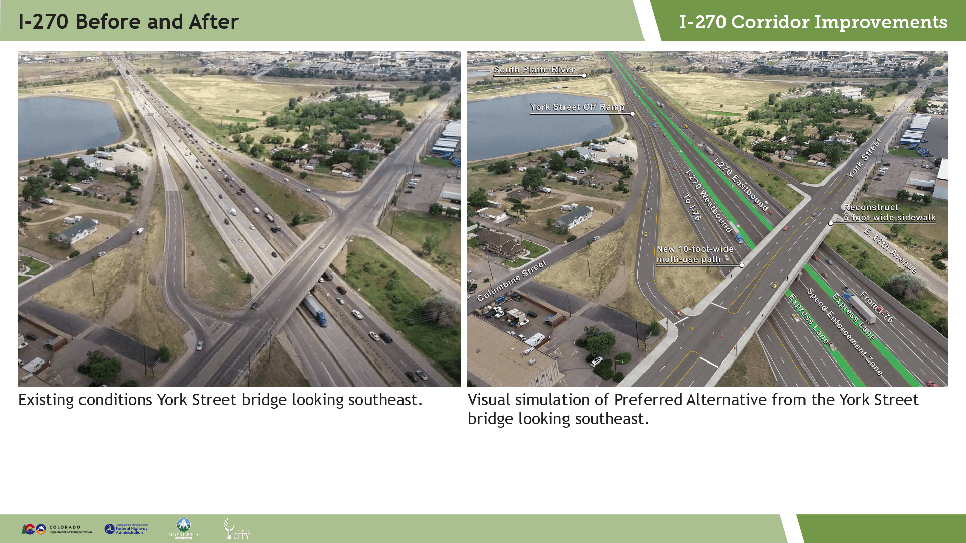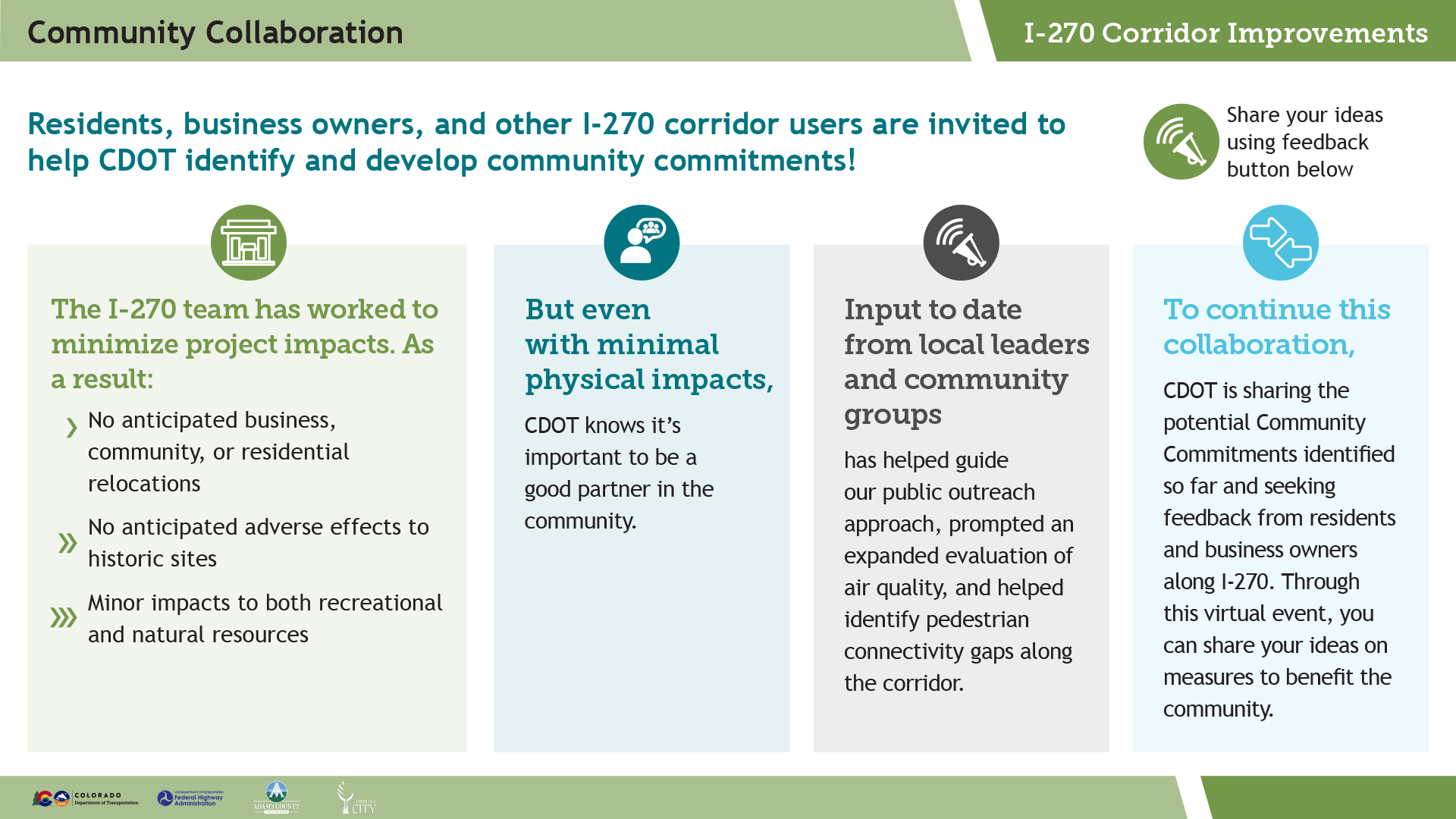 Hello and welcome to our virtual open house. I-270 is the most congested freeway in the state of Colorado. CDOT is looking forward to making improvements in this corridor to better accommodate many forms of transportation. If you missed our previous virtual events in 2020 you can get up to speed by viewing past meeting contents on the project website at the link in the presentation below this video. Scroll through our open house and read through the information below to learn about community commitments, project design details and the project schedule. Express Lanes are included in the Preferred Alternative. Analysis and support for this decision is included in the detailed comparison with a traditional general purpose lane. When you see information that you have a question about or would like to provide input on, use the comment box below each display to submit your question or comment. If you’d like to stay informed in the future, scroll to the bottom of this open house site to sign up for email updates. Thank you for helping us shape the future of the I-270 corridor.
