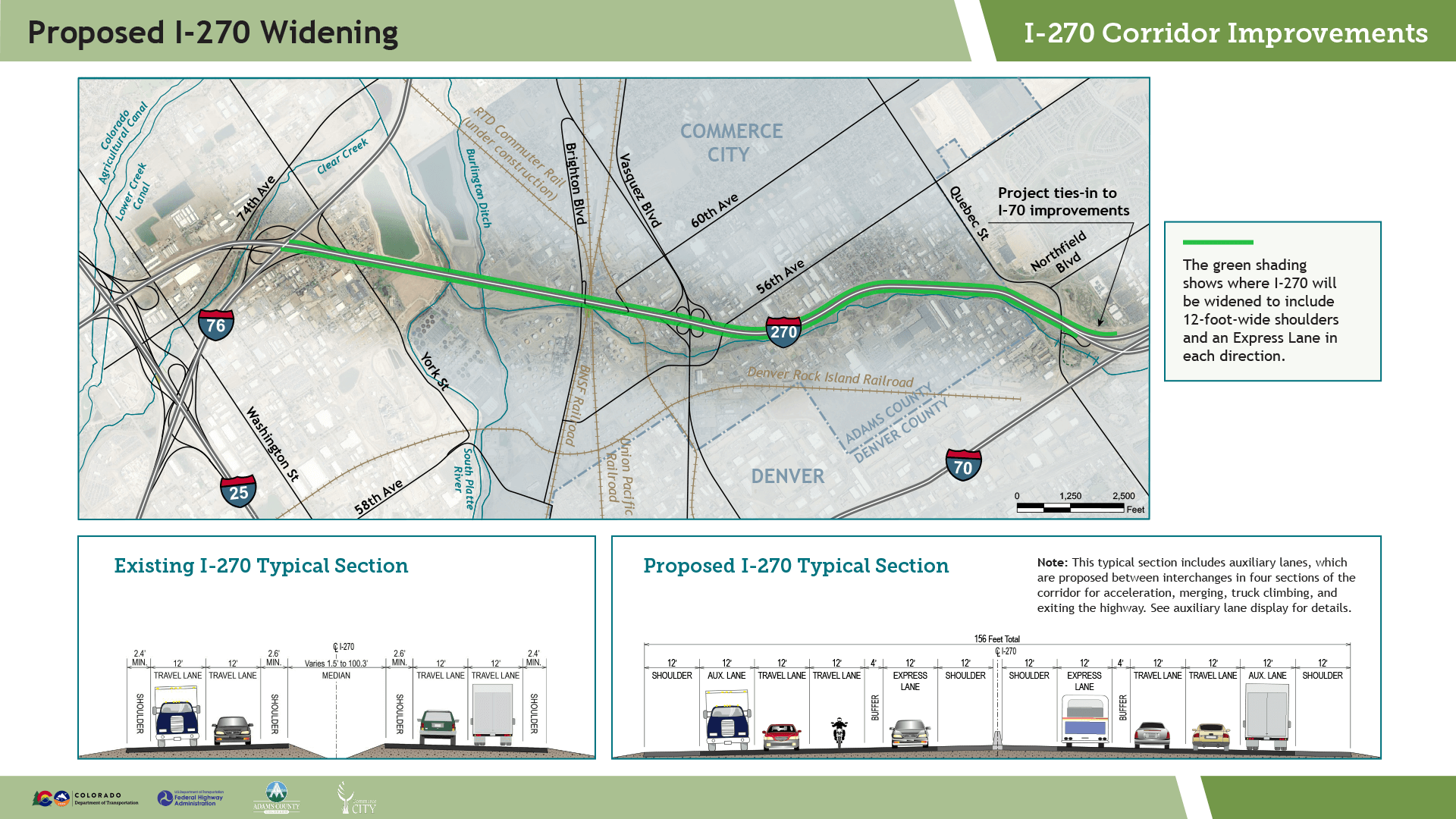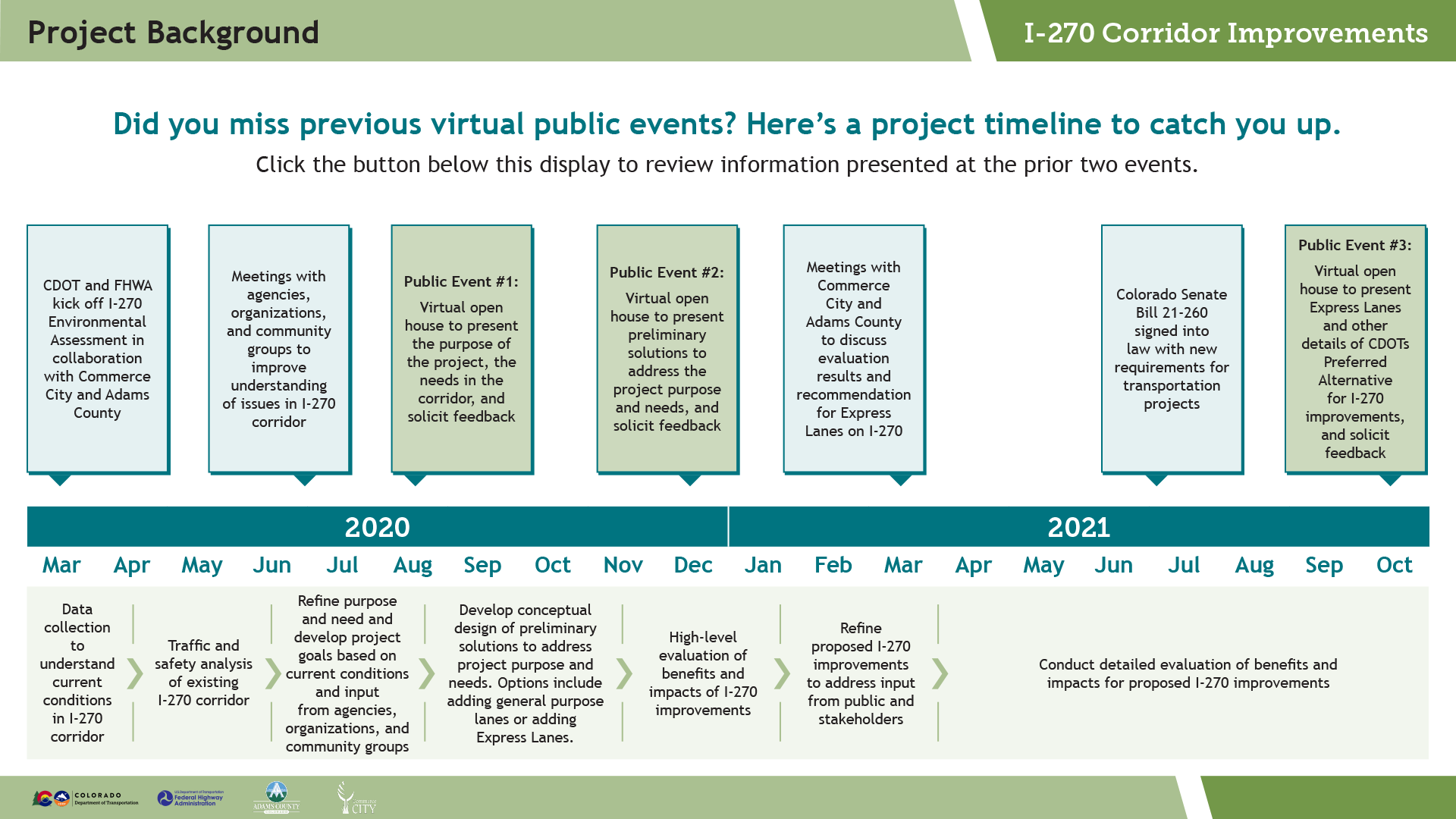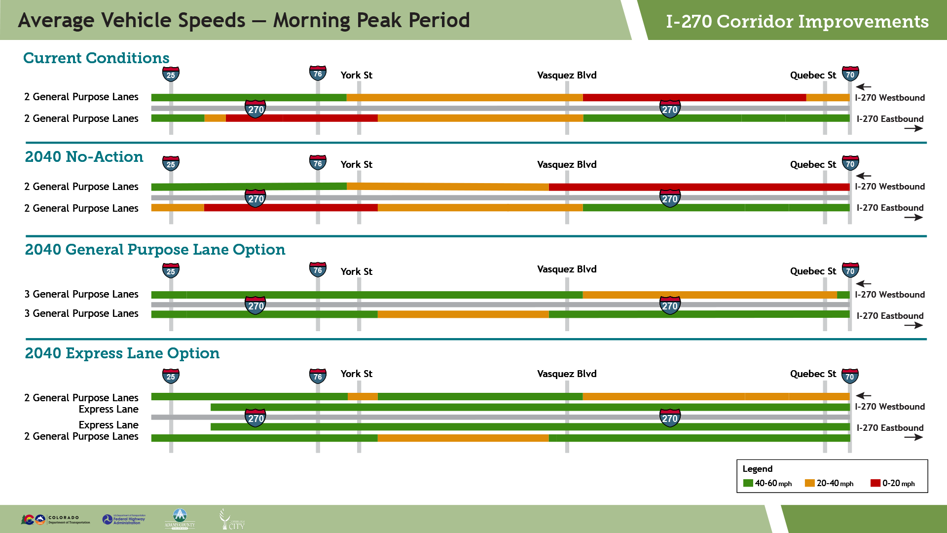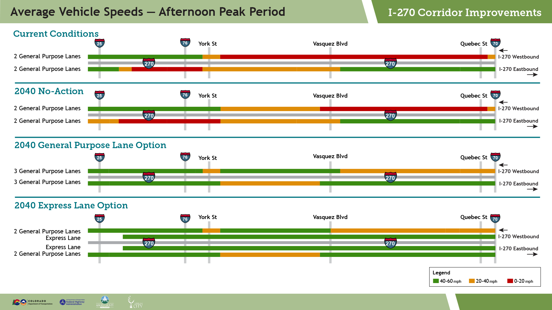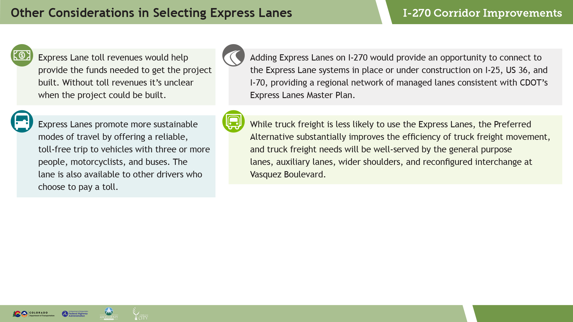 Hello and welcome to our virtual open house. I-270 is the most congested freeway in the state of Colorado. CDOT is looking forward to making improvements in this corridor to better accommodate many forms of transportation. If you missed our previous virtual events in 2020 you can get up to speed by viewing past meeting contents on the project website at the link in the presentation below this video. Scroll through our open house and read through the information below to learn about community commitments, project design details and the project schedule. Express Lanes are included in the Preferred Alternative. Analysis and support for this decision is included in the detailed comparison with a traditional general purpose lane. When you see information that you have a question about or would like to provide input on, use the comment box below each display to submit your question or comment. If you’d like to stay informed in the future, scroll to the bottom of this open house site to sign up for email updates. Thank you for helping us shape the future of the I-270 corridor.