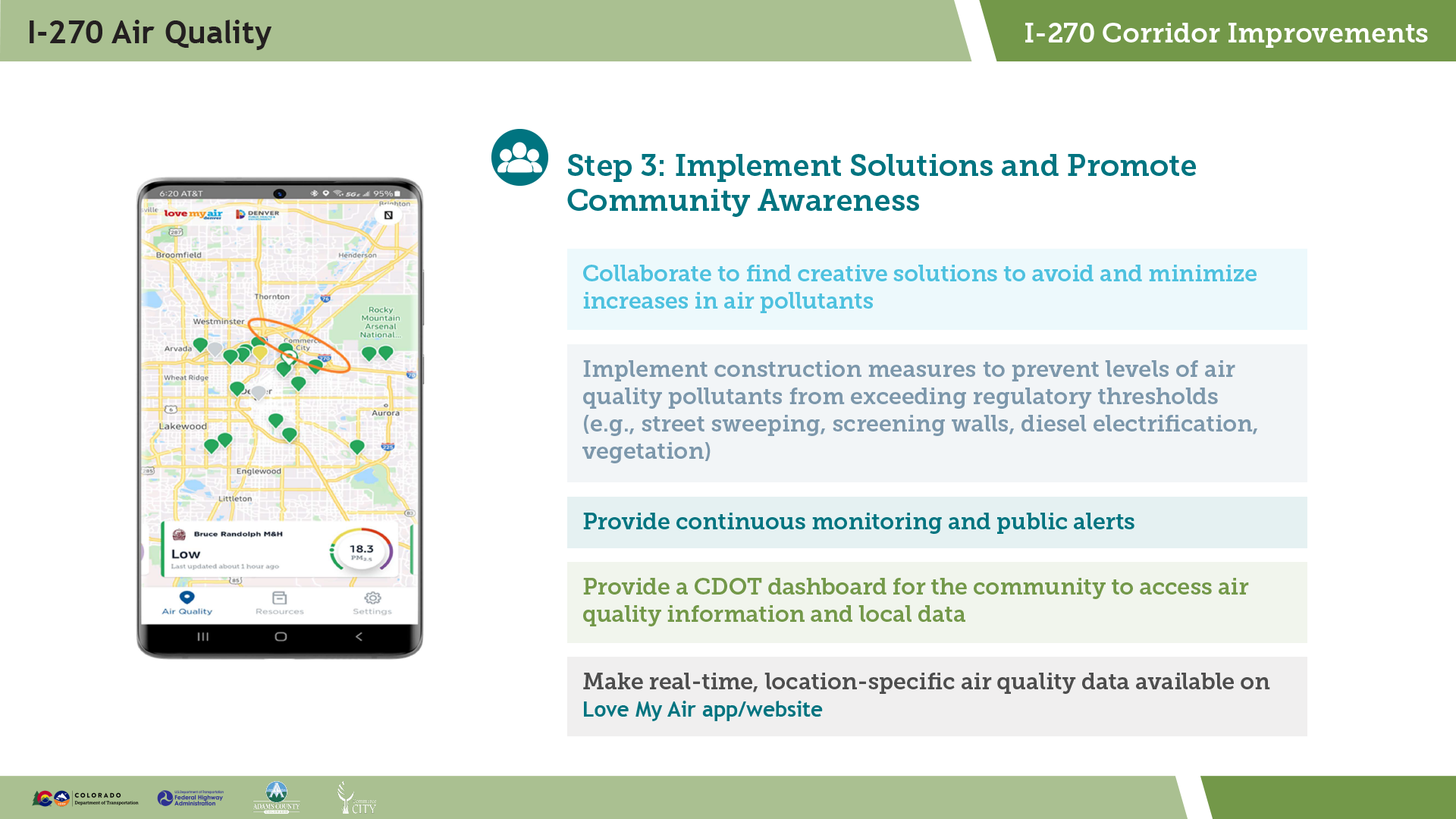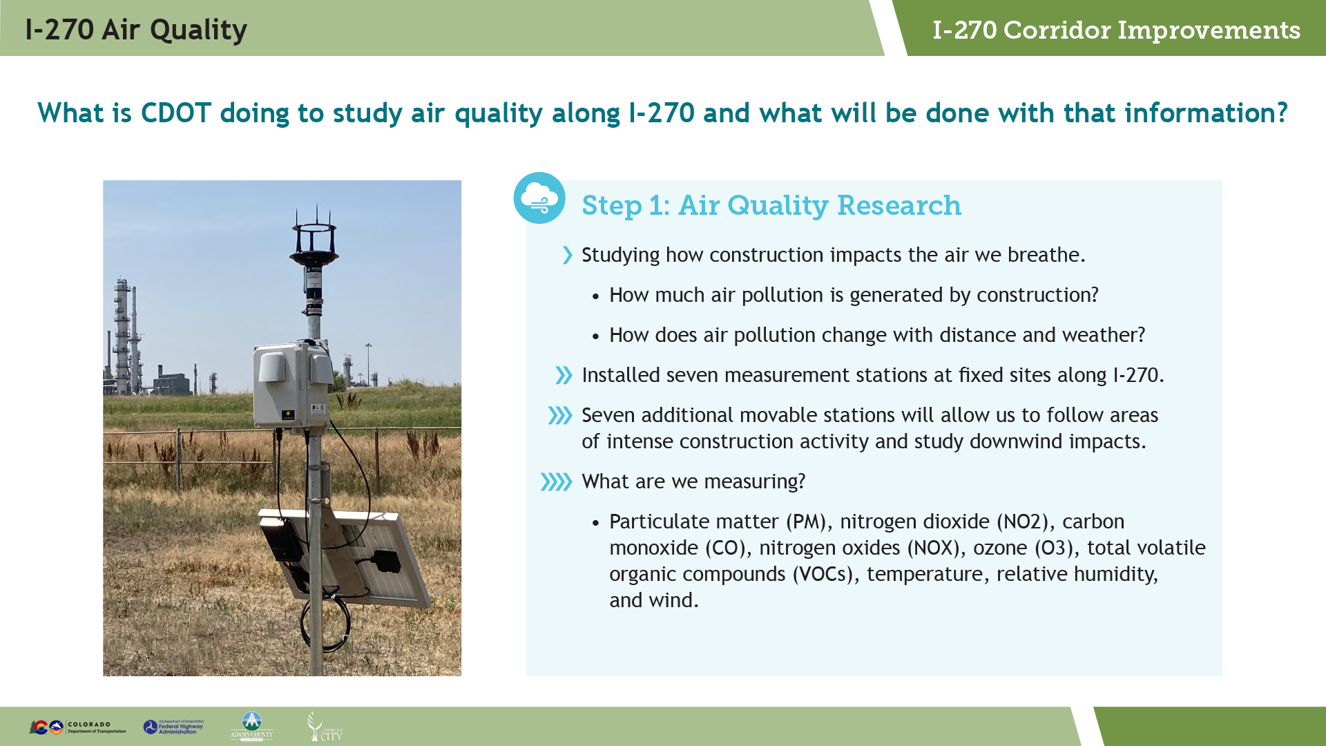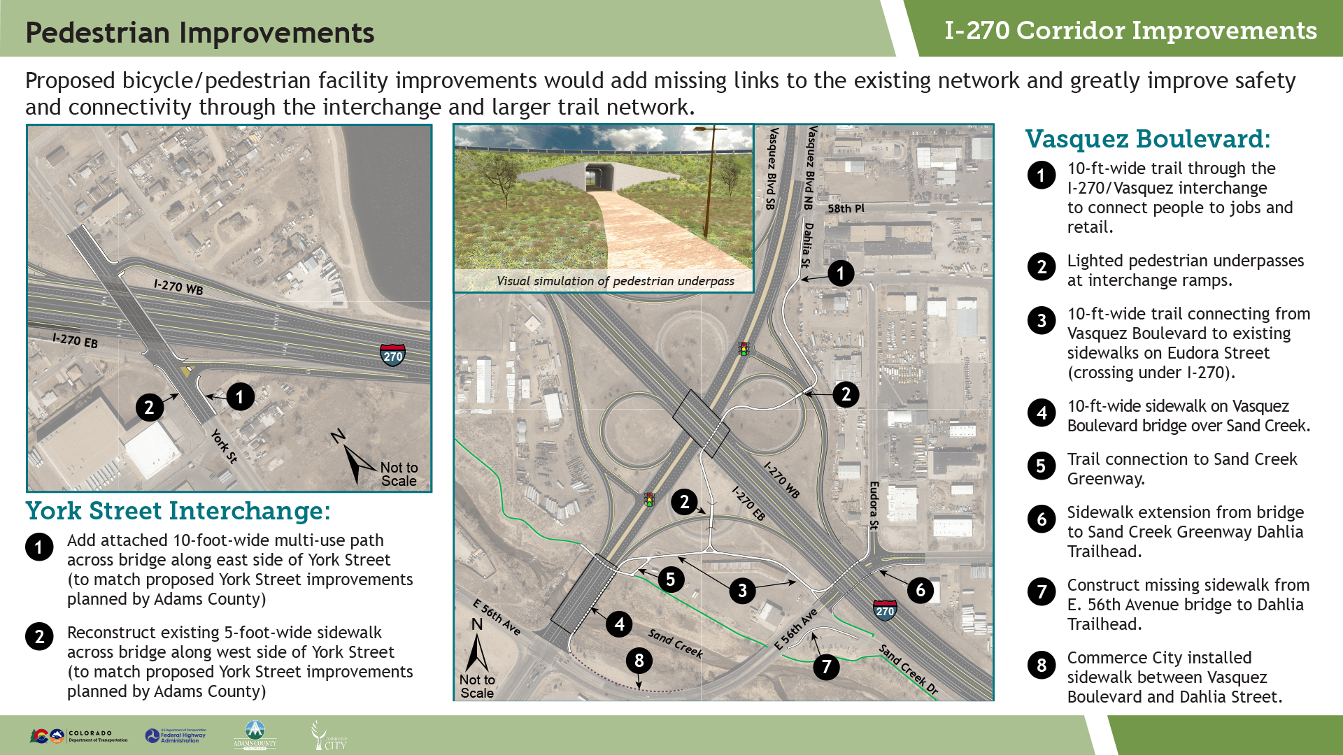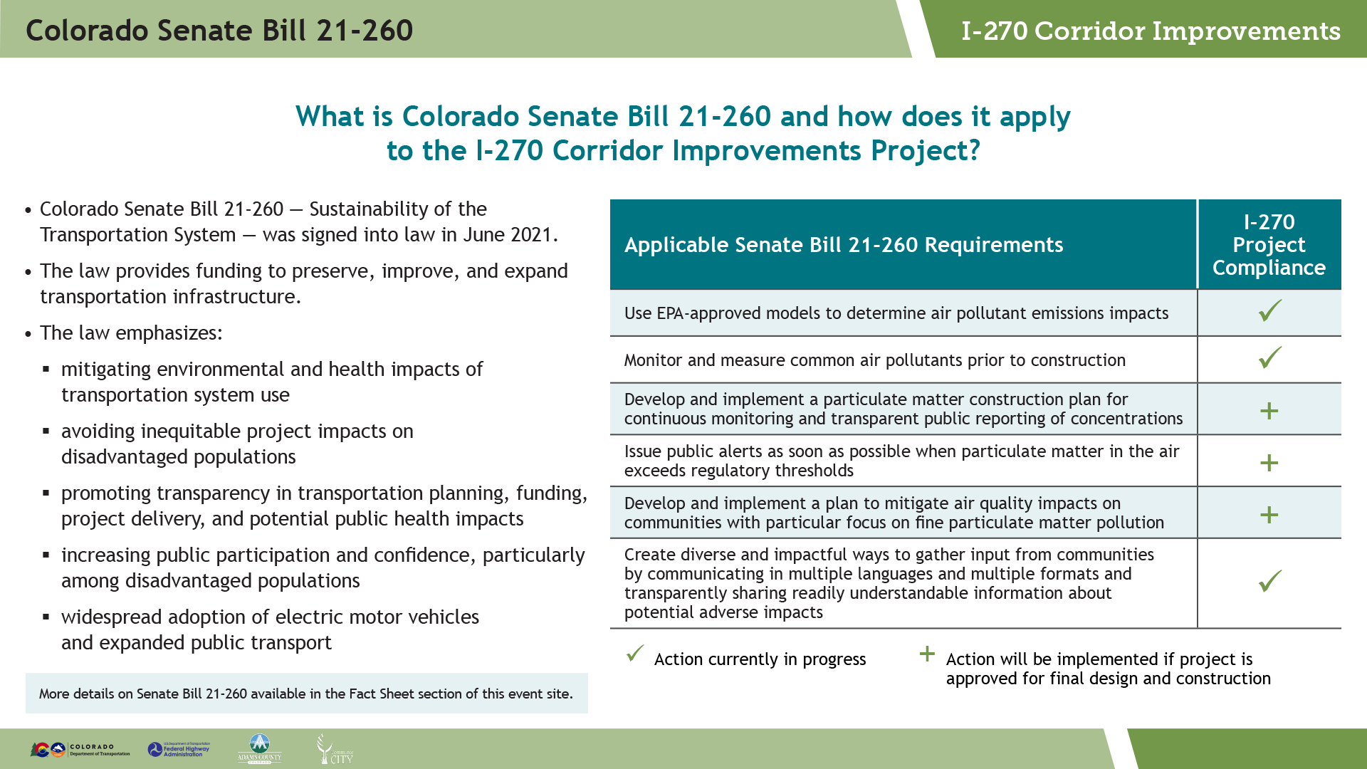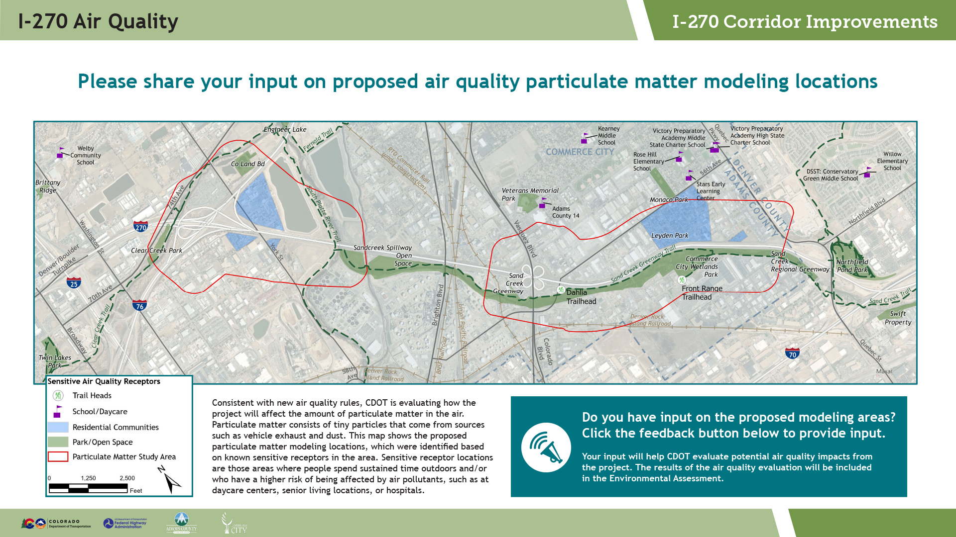 Hello and welcome to our virtual open house. I-270 is the most congested freeway in the state of Colorado. CDOT is looking forward to making improvements in this corridor to better accommodate many forms of transportation. If you missed our previous virtual events in 2020 you can get up to speed by viewing past meeting contents on the project website at the link in the presentation below this video. Scroll through our open house and read through the information below to learn about community commitments, project design details and the project schedule. Express Lanes are included in the Preferred Alternative. Analysis and support for this decision is included in the detailed comparison with a traditional general purpose lane. When you see information that you have a question about or would like to provide input on, use the comment box below each display to submit your question or comment. If you’d like to stay informed in the future, scroll to the bottom of this open house site to sign up for email updates. Thank you for helping us shape the future of the I-270 corridor.
