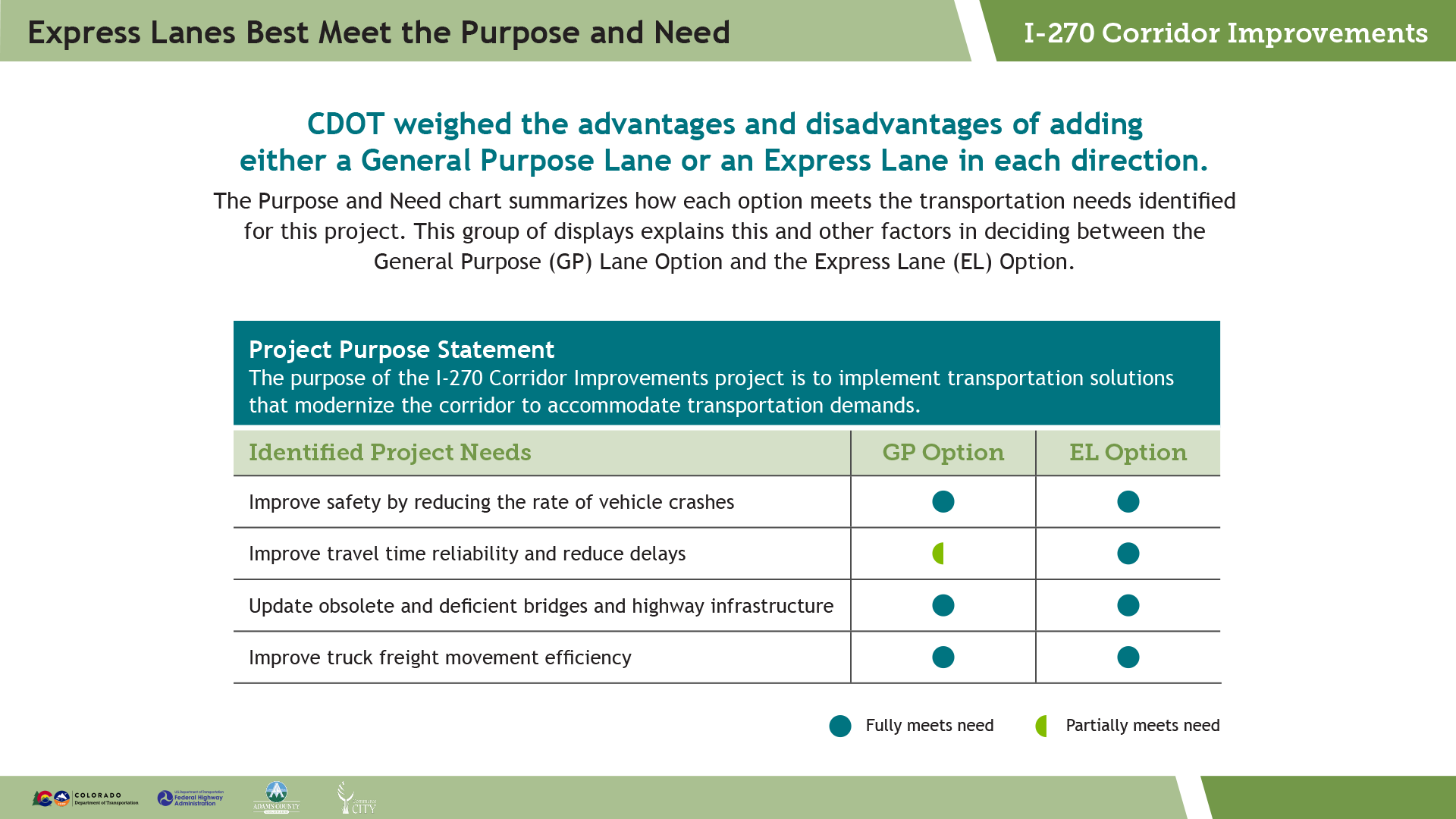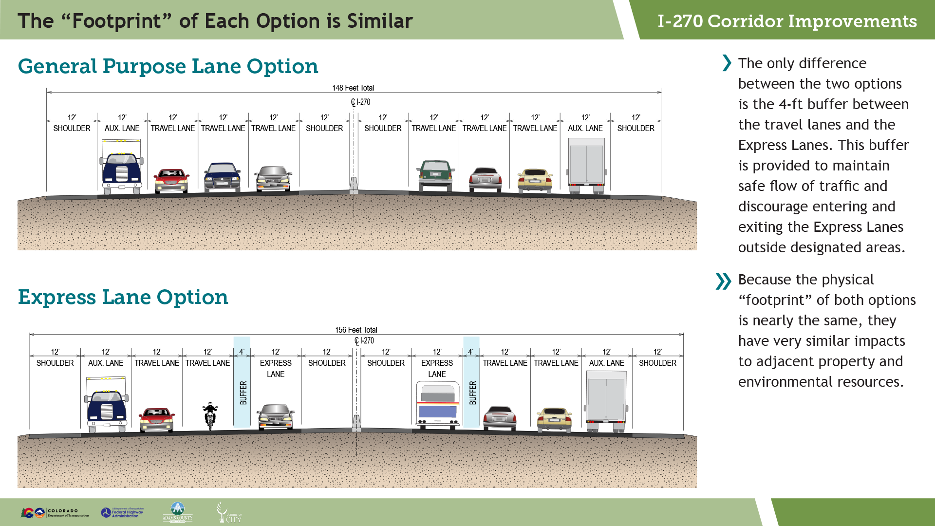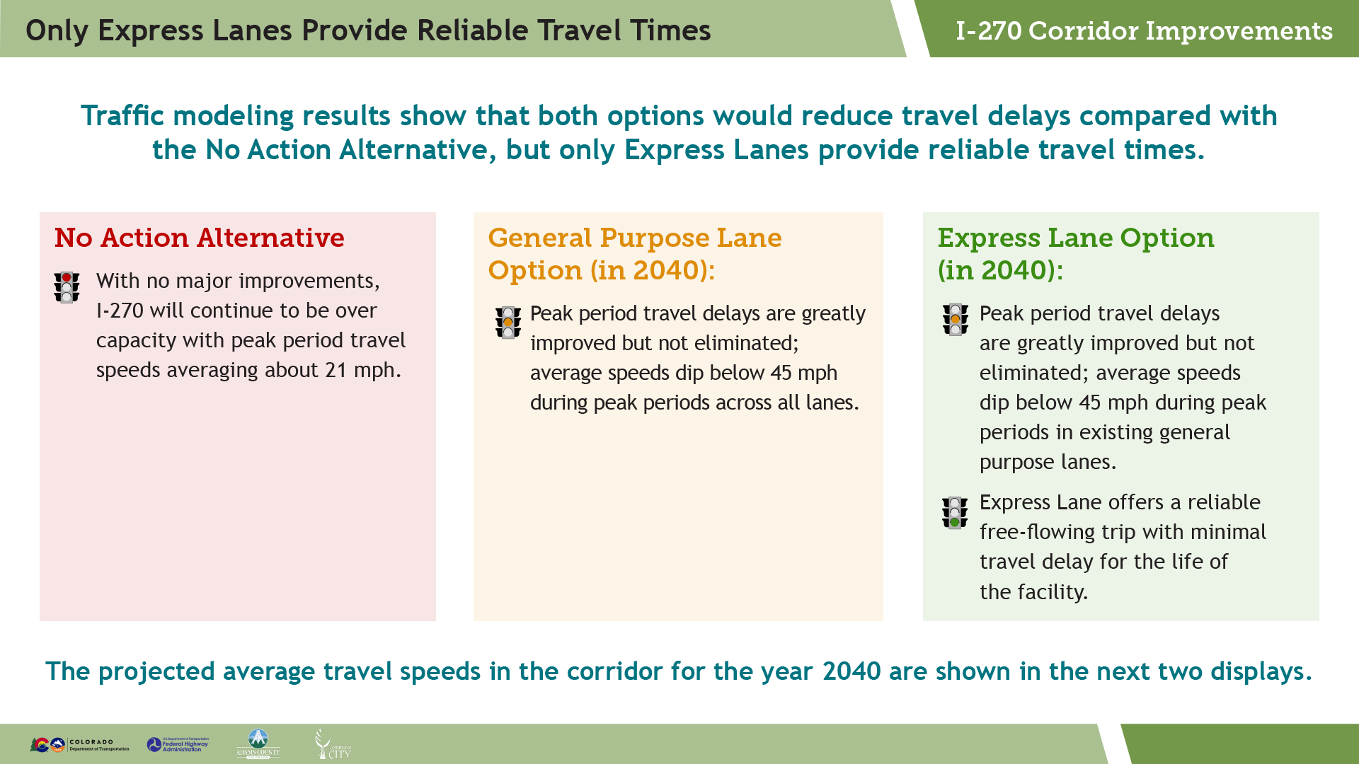 Welcome. The future of I-270 is taking shape. We appreciate your participation in this virtual open house. CDOT has analyzed two operating options considered for I-270 — General Purpose Lanes and Express Lanes — and has identified Express Lanes as part of the Preferred Alternative for improving I-270. We look forward to receiving your input on all elements of the Preferred Alternative presented in the information below.
